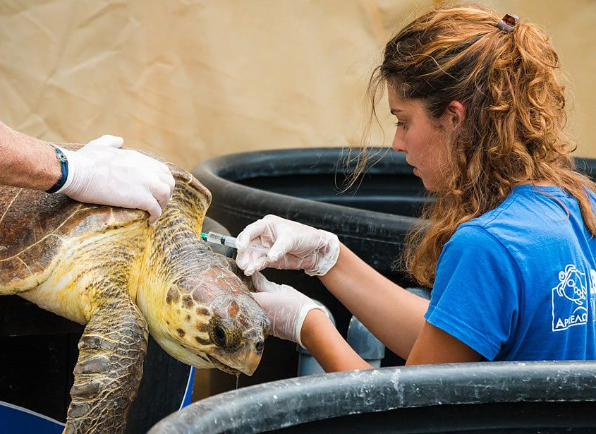 - Περίθαλψη θαλάσσιων χελωνών: τα καθήκοντα περιλαμβάνουν την προετοιμασία τροφής (συνήθως ψάρια) και το τάισμα των χελωνών, καθημερινή περίθαλψη των ζώων σύμφωνα με τις οδηγίες των κτηνιάτρων (φαρμακευτική αγωγή, καθάρισμα τραυμάτων), καθαρισμό/απολύμανση των δεξαμενών περίθαλψης ή προετοιμασίας, καθώς και λήψη βιομετρικών δεδομένων και καταγραφή παρατηρήσεων συμπεριφοράς. Τα παραπάνω συνιστούν μέρος της καθημερινής λειτουργίας του Κέντρου Διάσωσης, όπου φιλοξενούνται τον χειμώνα κατά μέσο όρο 25 έως 30 χελώνες και το καλοκαίρι 35-40 χελώνες υπό περίθαλψη. Να σημειωθεί ότι πρόκειται για καθήκοντα που απαιτούν υψηλού βαθμού φυσική κατάσταση και αρκετή σωματική δύναμη.